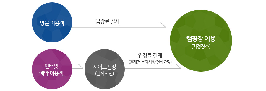 캠핑장 입장은 반드시 관리 사무실에서 예약자 확인을 하시고 관리자의 안내에 따라 입장하셔야 합니다. |